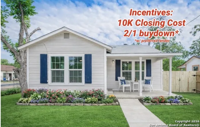Charming single-story 1,768 sq ft home on a corner lot with flexible living space and recent updates throughout. Enjoy new flooring, fresh interior paint, Low-E windows, and refreshed baths with new vanities. The layout offers a dedicated living room plus an open kitchen/dining combo with a breakfast bar and large windows for great natural light. A private rear suite includes an adjoining bonus room that's ideal for a home office, nursery, workout space, or sitting area. With its own exterior entrance, it's a great setup for guests, multi-generational living, or potential rental opportunity . You'll also love the oversized laundry room, front porch, covered back patio, and fenced backyard with rear/side access parking. Convenient location with quick access to Fort Sam Houston, Downtown, and St. Philip's College.